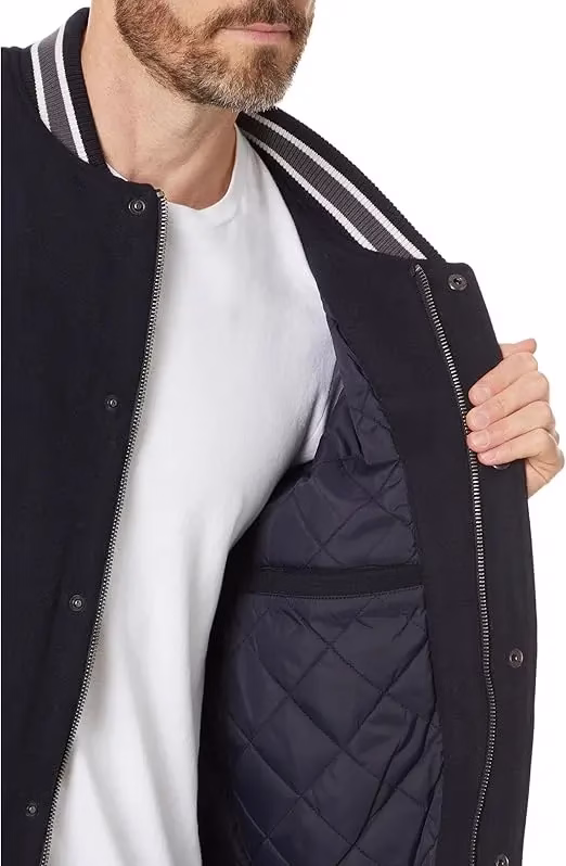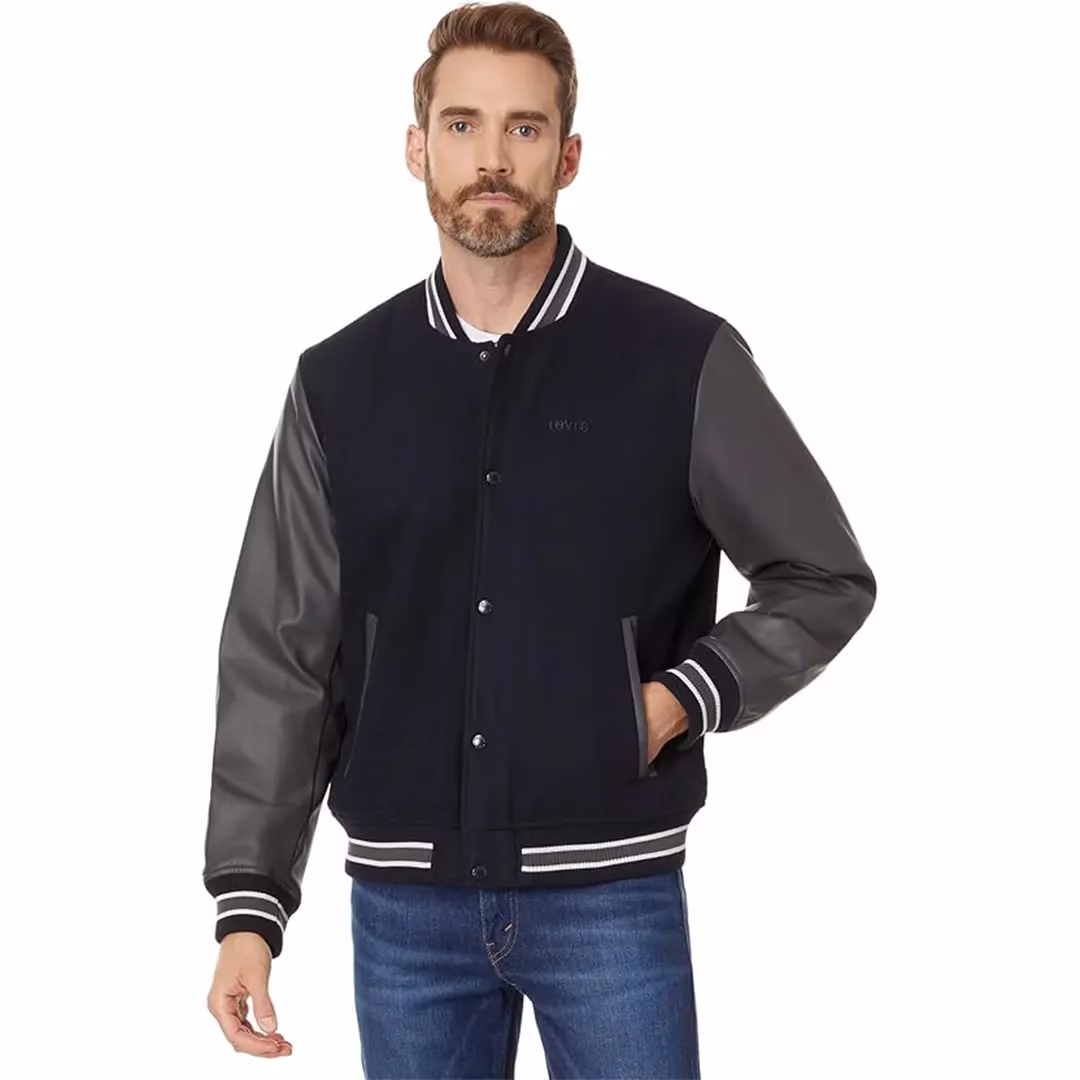 - Mangas de piel sintética en contraste con cuerpo de gamuza sintética suave, rayas universitarias en tejido de canalé en el dobladillo, los puños y el cuello.